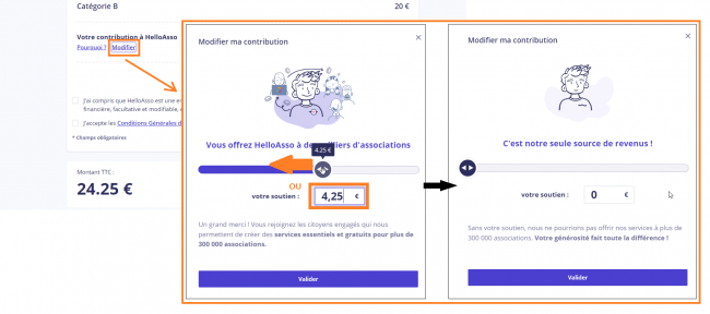 - HelloAsso nous permet de vous proposer ce formulaire, leur moyen de rémunération est la contribution demandée au moment du paiement , vous pouvez la modifier pour la rendre à 0 € soit en déplaçant le curseur vers la gauche soit en modifiant la somme directement :